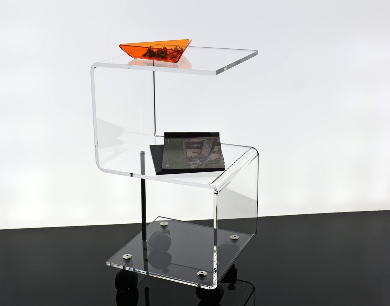 Slato Ebe Tavolino in cristallo acrilico trasparente a tre ripiani con ruote,compatto/leggero/design elegante, adatto per soggiorno,lato divano,Made in Italy cm.L.30 x P.30 x H58